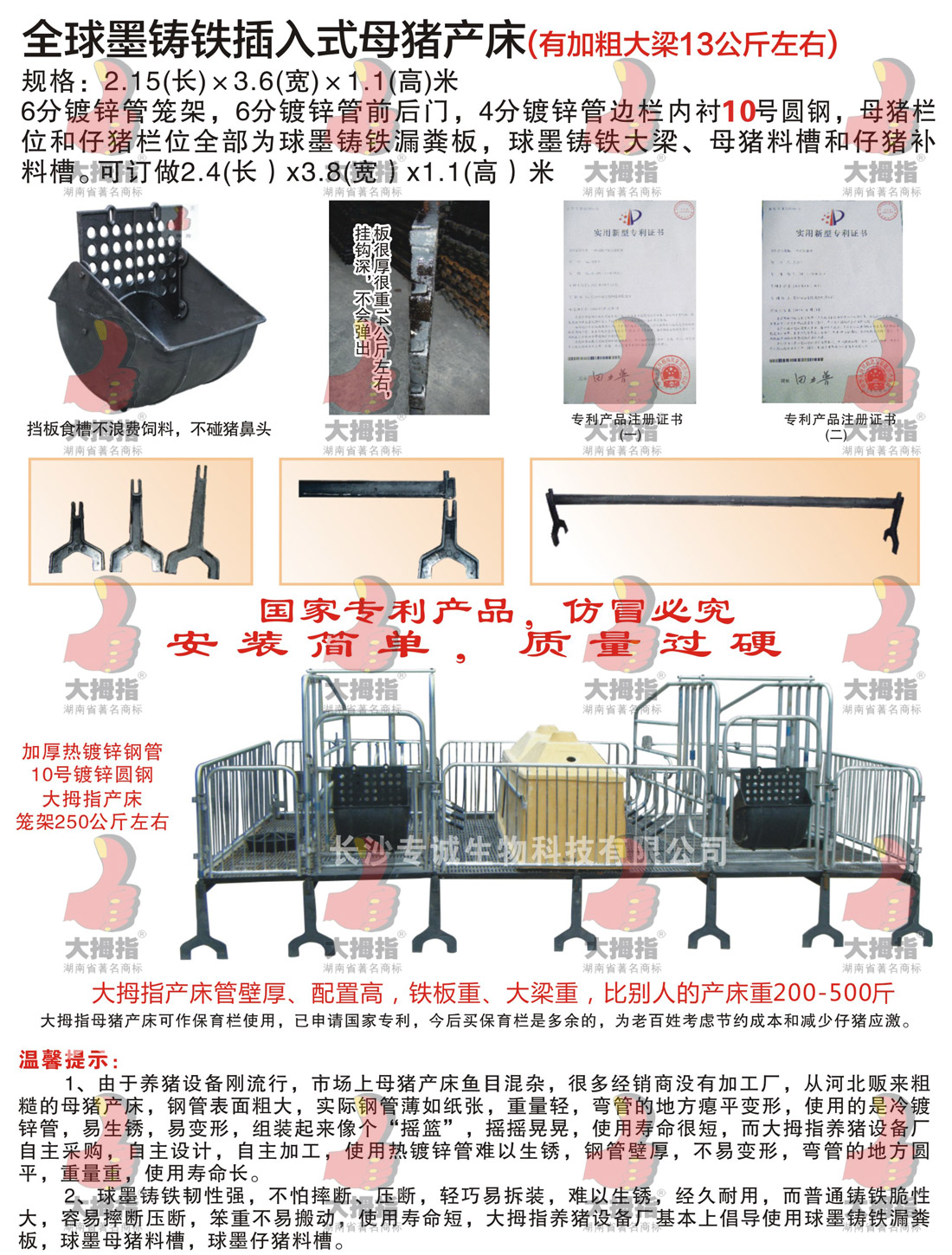 大拇指根據(jù)客戶(hù)需要,加厚焊管制造完畢采用里外熱浸鋅,不用擔(dān)心焊接處生銹。無(wú)論焊管和熱鍍鋅鋼管,大拇指采用很厚的材料,母豬產(chǎn)床上部分籠架在500斤左右,母豬產(chǎn)床1200-1500斤左右,比一般的產(chǎn)床要重500斤左右。